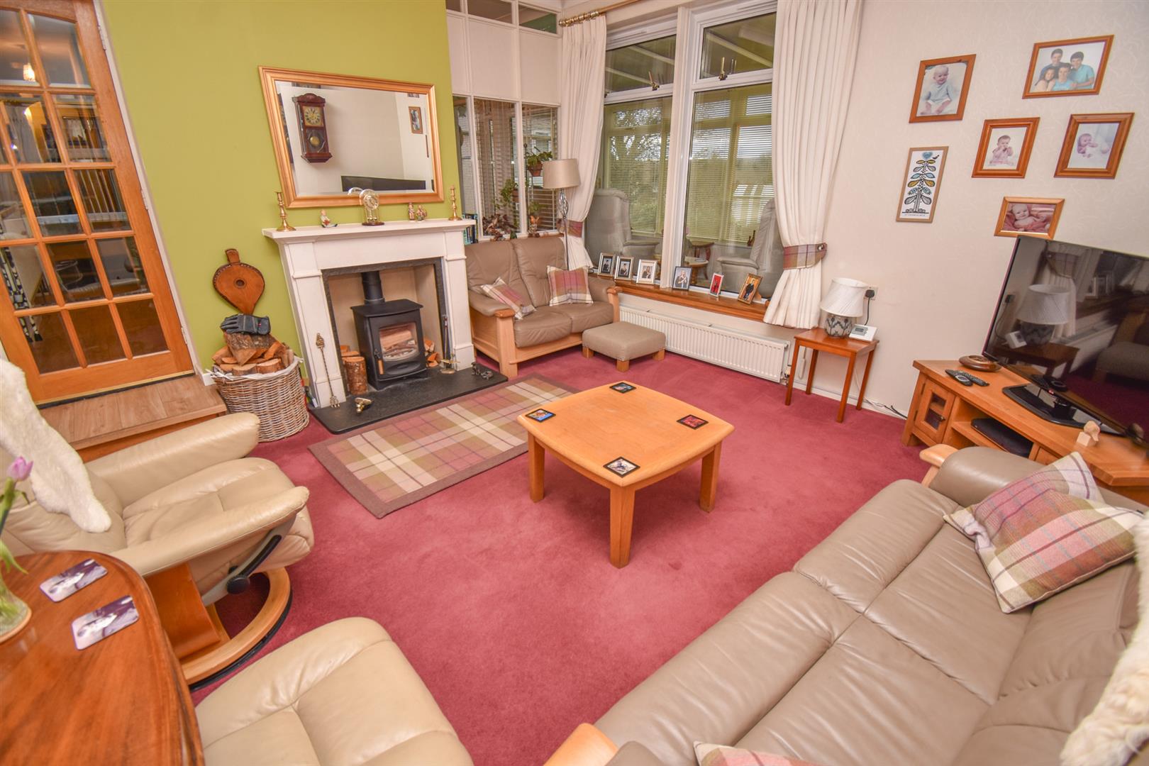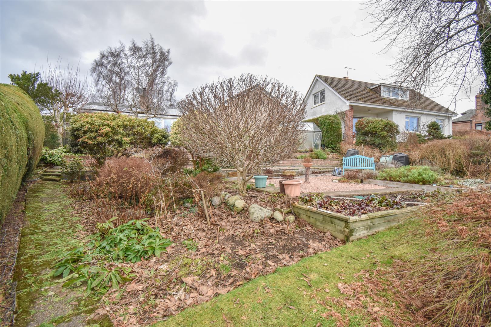 The conservatory gives access to the tiered rear garden, which is well-maintained and offers privacy with it’s mature trees and shrubs, as well as attracting an abundance of wildlife. This area is a combination of gravel and lawn, with a well placed patio area, perfect for enjoying al-fresco dining and the sunshine. It also boasts a vegetable patch, and sited here are two wooden sheds and a green house. The front of the property has a colourful flower border and a lengthy driveway, giving space for parking. This leads to the detached single garage which has power, lighting and a pedestrian door.