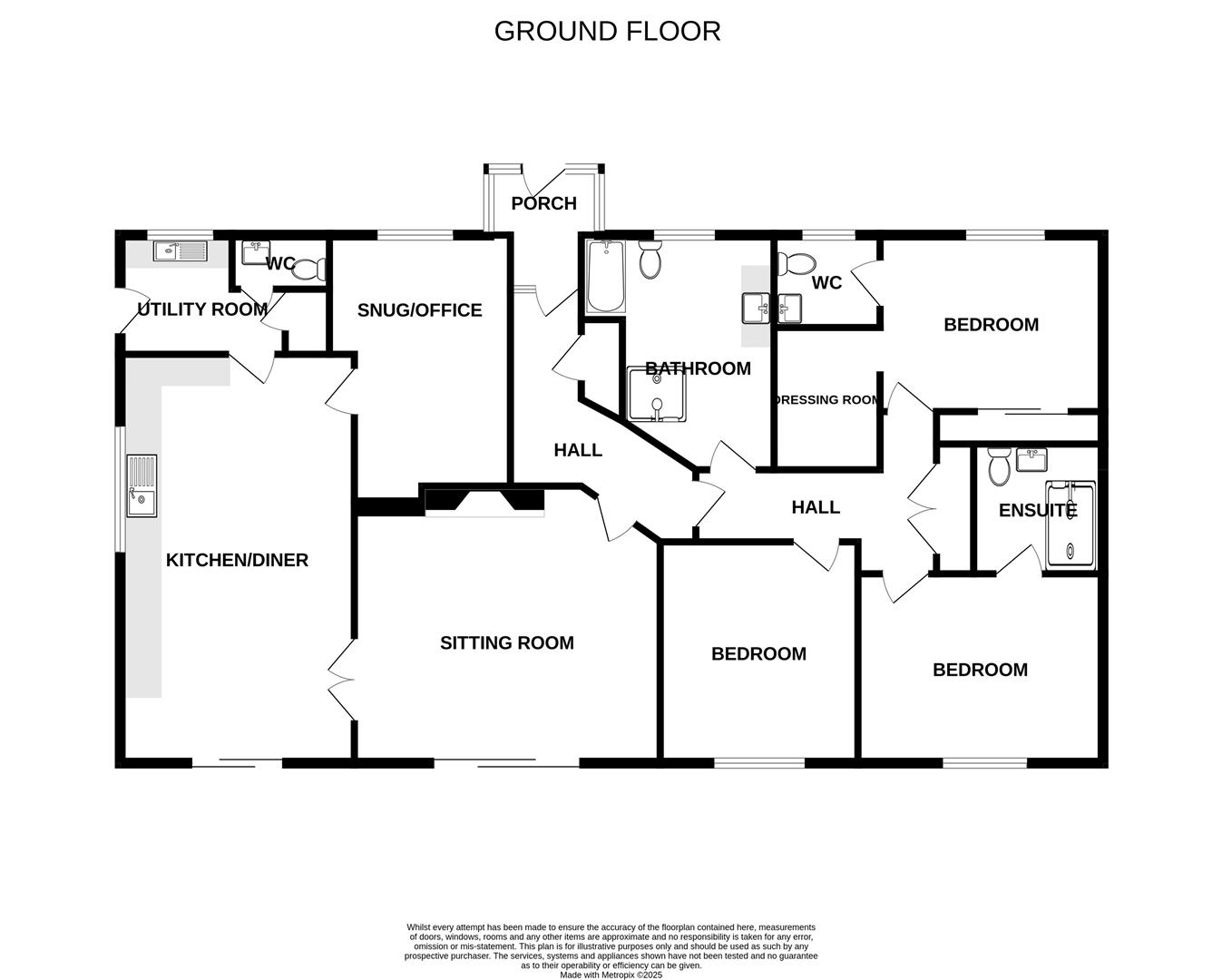 Occupying an enviable plot surrounded by woodland, Nayrendah is a luxurious, three bedroomed detached bungalow that offers modern and comfortable living space that would suit families and appeal to professionals working from home. Finished to an exacting standard, the property offers a wealth of features including a walk-in wardrobe, an en-suite shower room, double glazed windows, oil fired heating, and ample storage provisions. The accommodation within comprises a bright and airy entrance porch and hallway (that has two storage cupboards & loft access) an office/snug, and a lounge which is of a generous size, but provides a cosy environment and has a feature open fire with marble surround, and doors to the hallway, kitchen and rear elevation. The fully equipped kitchen/diner forms heart of the home and provides ample space for a large table and chairs for formal dining, whilst having the advantage of a patio door, giving access to the decking area and private rear garden. The kitchen features a range of sleek wall and base mounted units with stunning worktops, which is mirrored in the breakfast island, and has splashback tiling, and a 1 ½ sink drainer with mixer tap. Integrated appliances include a fridge-freezer, dishwasher, an electric hob with extractor fan over, and an eye-level electric oven/grill. This room is beautifully finished with Herringbone flooring. From here, there is a door to the utility room which has mounted units, a stainless steel sink, plumbing for washing machine, and further doors to the useful WC, and side elevation. Off the hallway are three double bedrooms, with the principle bedroom benefiting from en-suite shower room. The second bedroom boasts a walk-in wardrobe, with additional mirrored wardrobes and a WC with wash hand basin, and the third bedroom being fitted with an open wardrobe. Completing the accommodation is the family bathroom which offers stylish wall and floor tiling and consists of a vanity wash hand basin, WC, bathtub, and a shower cubicle with double shower head.